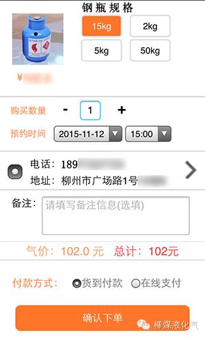 选择你需要的【购买数量】、【预约时间】、【送气地址】【付款方式】。